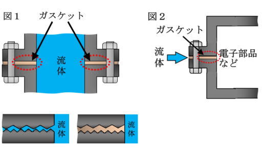 ガスケットとは構造に気密性、液密性を持たせるために用いる固定用のシール材です。図1のように内部の流体の漏れを防ぐものや、図2のように内部の電子部品などを外部の液体から守るものがあります。